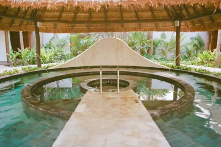 At Maroma Spa by Guerlain, the hydrotherapy circuit comprises an indoor sauna, separated for males and females, before guests venture outside to the open-air facilities surrounded by nature, enjoy a refreshing shower followed by the steam room before proceeding to the cold plunge pool, warm and hot pools for contrast therapy to relax muscles and stimulate circulation.