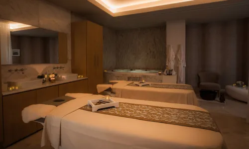 El Aura Spa ofrece una experiencia de bienestar integral que combina instalaciones de hidroterapia de vanguardia, tratamientos holísticos y un excepcional servicio al huésped. La amplia zona de hidroterapia cuenta con un sauna, una estimulante sala de hielo para refrescar y energizar el cuerpo después del sauna, duchas sensoriales, una sala de vapor aromática y loungers térmicos. Cada paso del proceso de hidroterapia es guiado por un asistente experto, y entre cada experiencia se sirven elixires y shots saludables para rehidratarse. Mientras se relajan en los loungers de piedra calentados, los huéspedes disfrutan de un relajante masaje de cuero cabelludo realizado por el asistente. Estas instalaciones están separadas para hombres y mujeres antes de fusionarse en la tranquila zona de la piscina, suavemente iluminada con linternas de velas que proyectan sombras sobre las impresionantes paredes de mármol. La piscina sensorial ofrece chorros para hombros y la parte superior de la espalda, además de camas de burbujas; junto a ella se encuentra un jacuzzi caliente, mientras que una piscina polar proporciona un refrescante contraste.