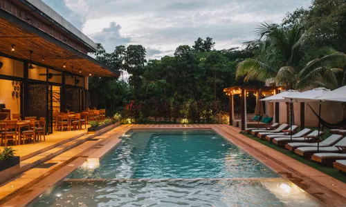 Escondido en el corazón de Yucatán, rodeado por la densa vegetación de la región, se encuentra Destino Mío Mayan Jungle Retreat. Este santuario, diseñado para una profunda reconexión y renovación, transmite una sensación tanto íntima como expansiva. Con solo 15 alojamientos únicos (una colección de suites, tiendas de glamping y la casa principal de tres dormitorios, Casa Adolfo), ofrece una experiencia verdaderamente boutique, pero la propiedad abarca unas impresionantes 250 hectáreas, una vasta zona salvaje que alberga varios cenotes serenos. Para vivir una experiencia impresionante, asciende por la escalera de caracol de la emblemática torre mirador y contempla espectaculares ocasos donde tonos rosas, morados y naranjas llenan el cielo, y observa cómo las luciérnagas iluminan la selva al anochecer.