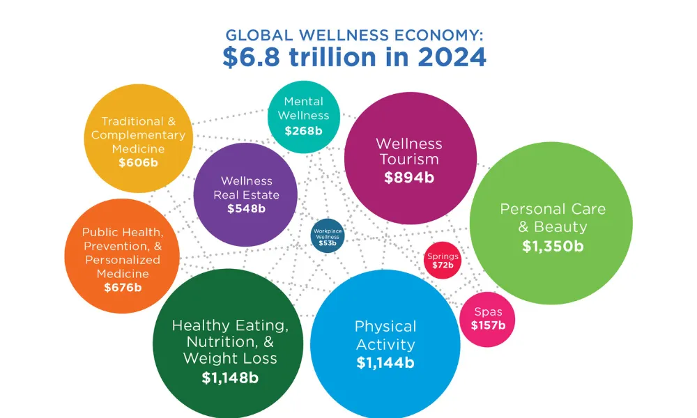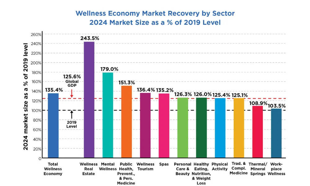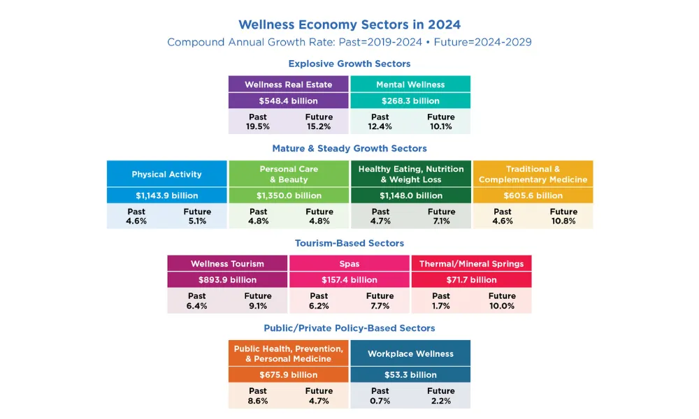 Los sectores de bienes raíces del bienestar y bienestar mental han experimentado un crecimiento explosivo. Actividad física, alimentación saludable, cuidado personal y belleza, y medicina tradicional y complementaria han experimentado un crecimiento constante. Los sectores relacionados con el turismo incluyen spas, aguas termales y turismo de bienestar. El turismo mundial creció un 1.9% en los últimos cinco años, mientras que el turismo de bienestar ha crecido un 6.4% anual. La salud pública, medicina preventiva y personalizada, y bienestar en el lugar de trabajo dependen en gran medida de las políticas.