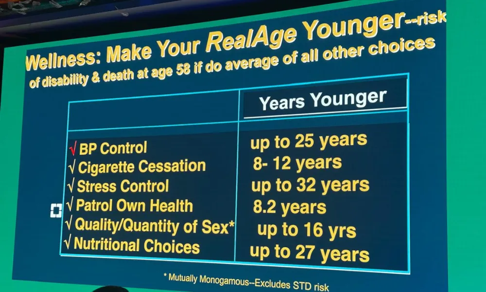 Michael nos pidió que nos imagináramos más jóvenes de lo que somos, con 40 años, aunque nuestro cuerpo tenga cronológicamente 90. Él define el bienestar como ralentizar el envejecimiento y la longevidad como revertir el envejecimiento. Haz que tu ‘edad real’ sea más joven, centrándote en varios factores de longevidad: