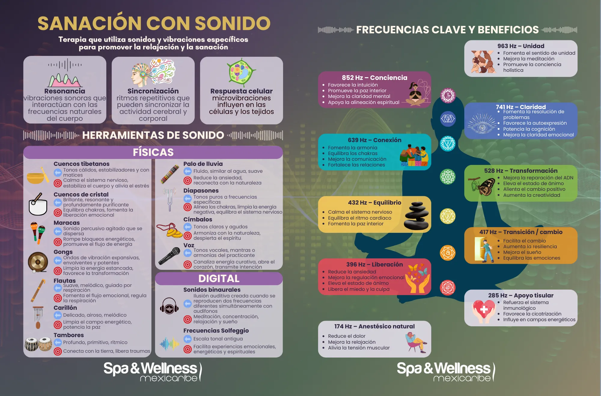 Las frecuencias sonoras, cuando se administran con precisión, crean una sincronización entre los hemisferios izquierdo y derecho del cerebro. Esta sincronización hemisférica produce una calma mental, permitiendo relajación profunda, meditación y dormir sin sueños. Mediante su uso repetido, este proceso de sincronización permite crear nuevas vías neuronales, promoviendo cambios de comportamiento para toda la vida.
