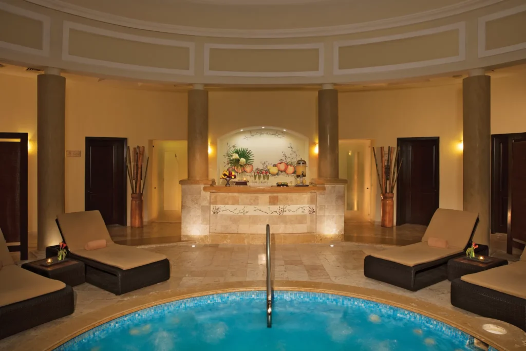 The hydrotherapy area centers around a large Jacuzzi with Roman style columns surrounding comfortable lounge chairs under a domed roof. Encircling this central oasis of calm are the steam room, sauna and treatment rooms, equipped for a range of body and face treatments, also accommodating couples as needed.